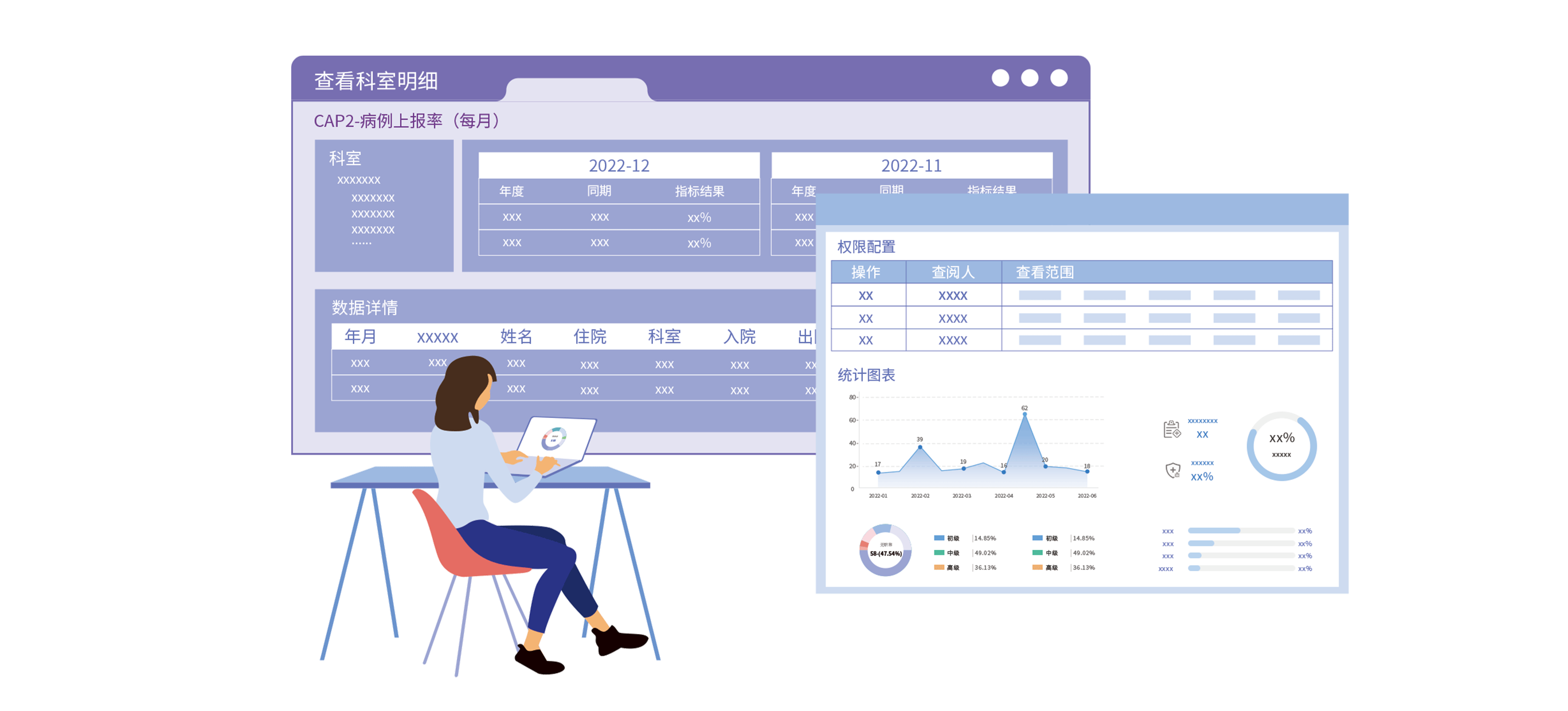 - 统计报告能展示各科室数据明细,以进行溯源。可以根据人员角色所关注的数据进行权限分配,提供丰富的统计分析工具,灵活地配置不同的报告,通过多维度统计数据情况,定位科室所存在的不足。