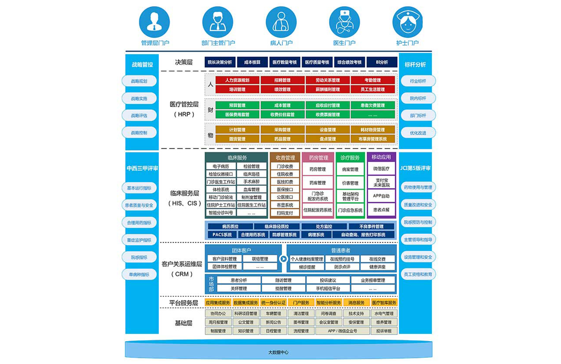 - 为了实现本院信息化建设与管理的可持续发展,本次项目遵循基于信息平台的一体化建设思路。医院信息化以患者为中心,以提高医院社会、经济效益,提高医院科学管理水平,提高医生医疗水平为基本点,实现医院全面信息化运营。