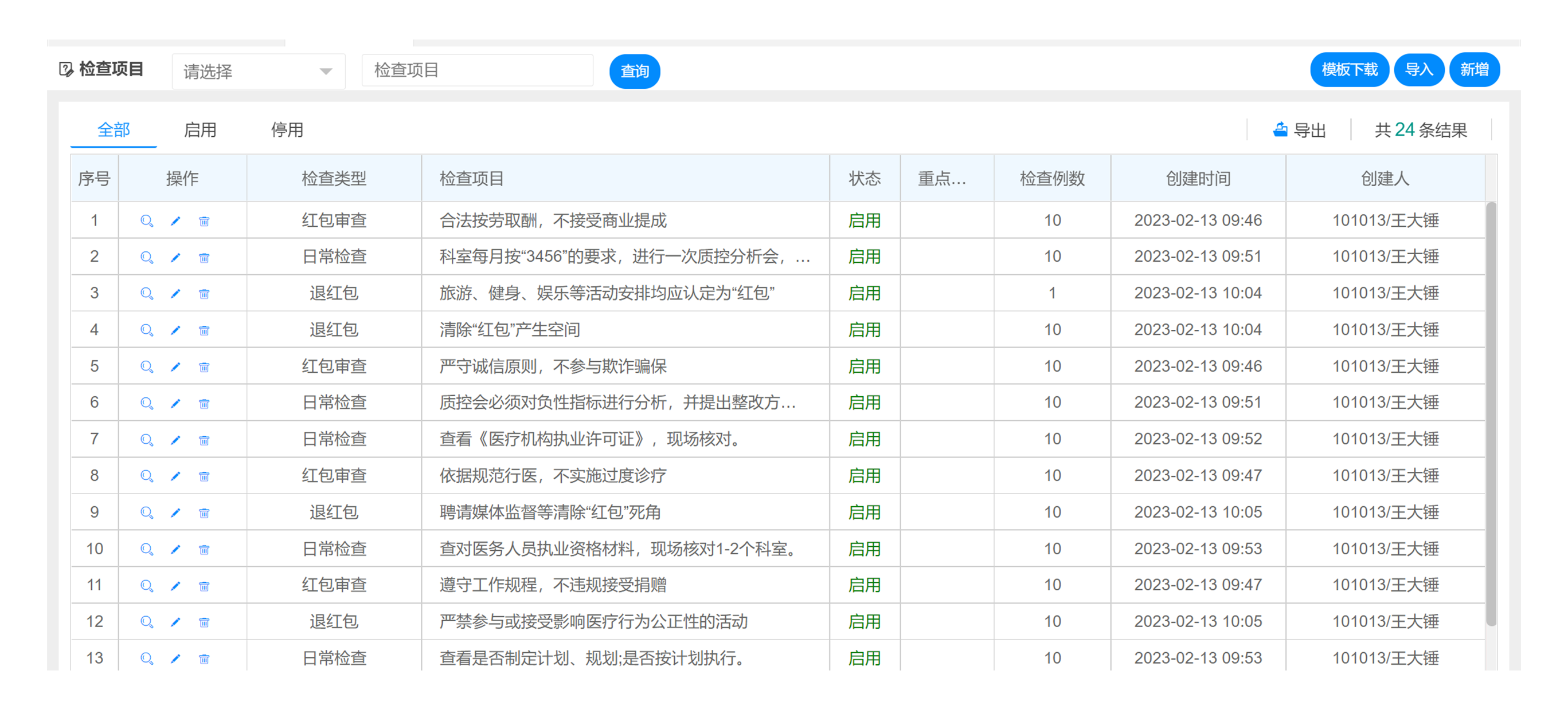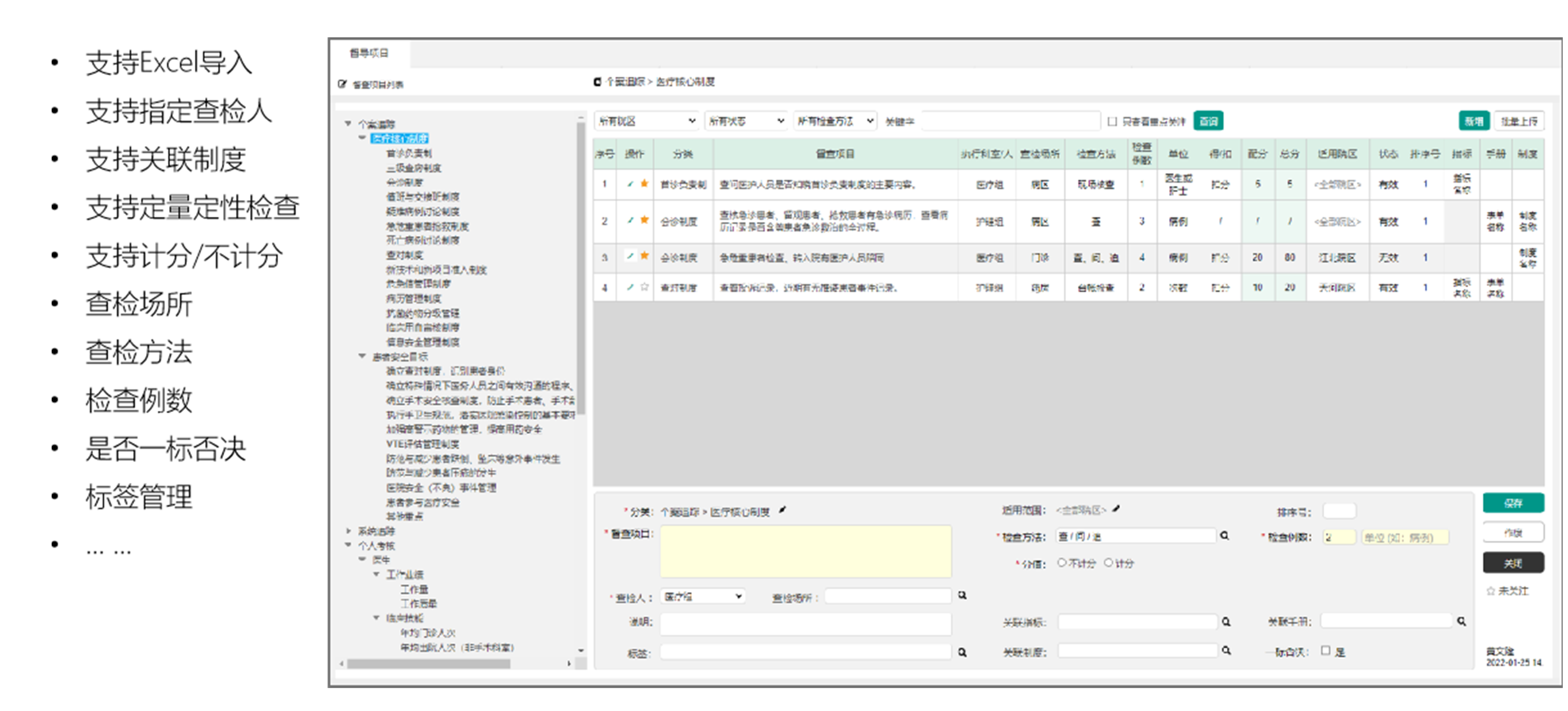 - 满足针对不同类型的风险管理,制定相关的督导检查条款,支持Excel导入、支持指定查检人、支持关联制度、支持定量定性检查、支持计分/不计分、查检场所、查检方法、检查例数、是否一标否决、标签管理...