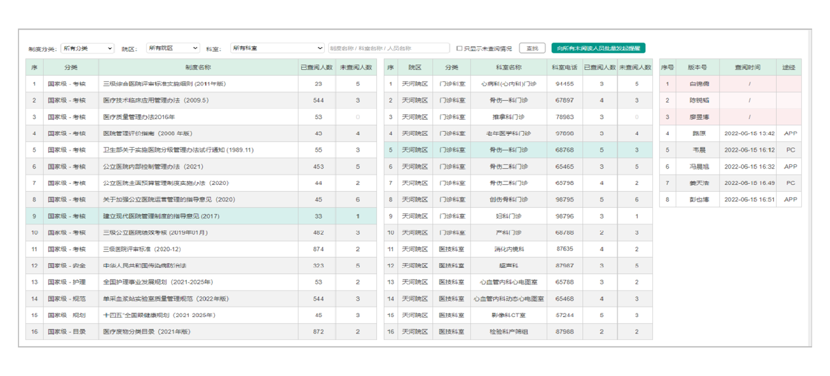 - 一、①支持 “ 国家级、省级、市级、院级、科室级 ” 分类管理、支持打标签分类管理,方便定位搜索 ②支持 “批量发布” 和 “批量更新”,文件重复自动批量提醒,方便制度维护 ③支持 “PC端” 和 “移动端”、支持 生成 水印、支持 下载 ④查看到所有相关人员对各个制度的查阅情况。 二、制度管理:①制度失效时间自动提醒、批量替换与更新; ②专家问答; ③支持打印、PDF导出; ④制度适用人群控制,阅读情况跟踪; 三、跟踪制度的查阅情况:如图