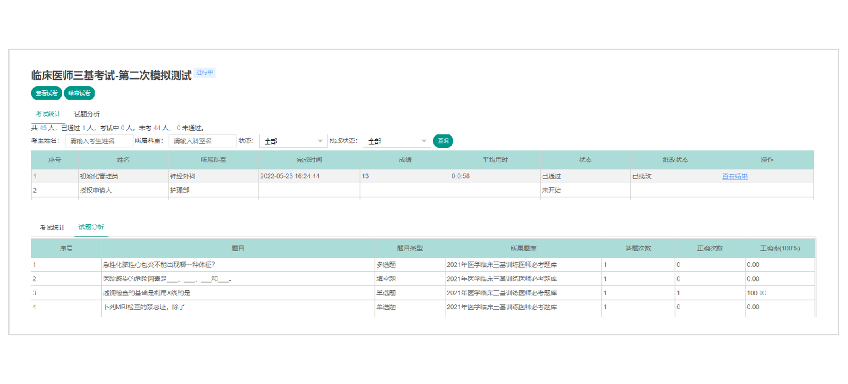 - ①从试卷库选择试卷,快速发起考试。 ②支持考试过程暂存,兼顾医护人员因为紧急工作需要而中断考试的情况。 ③从考试发起到结束,考生作答、评卷状态全过程跟踪管理。 ④考生提交试卷,系统自动评阅打分,考试结果即时呈现。 ⑤提供试卷分析,实时统计考生答题情况,全面掌握薄弱环节。