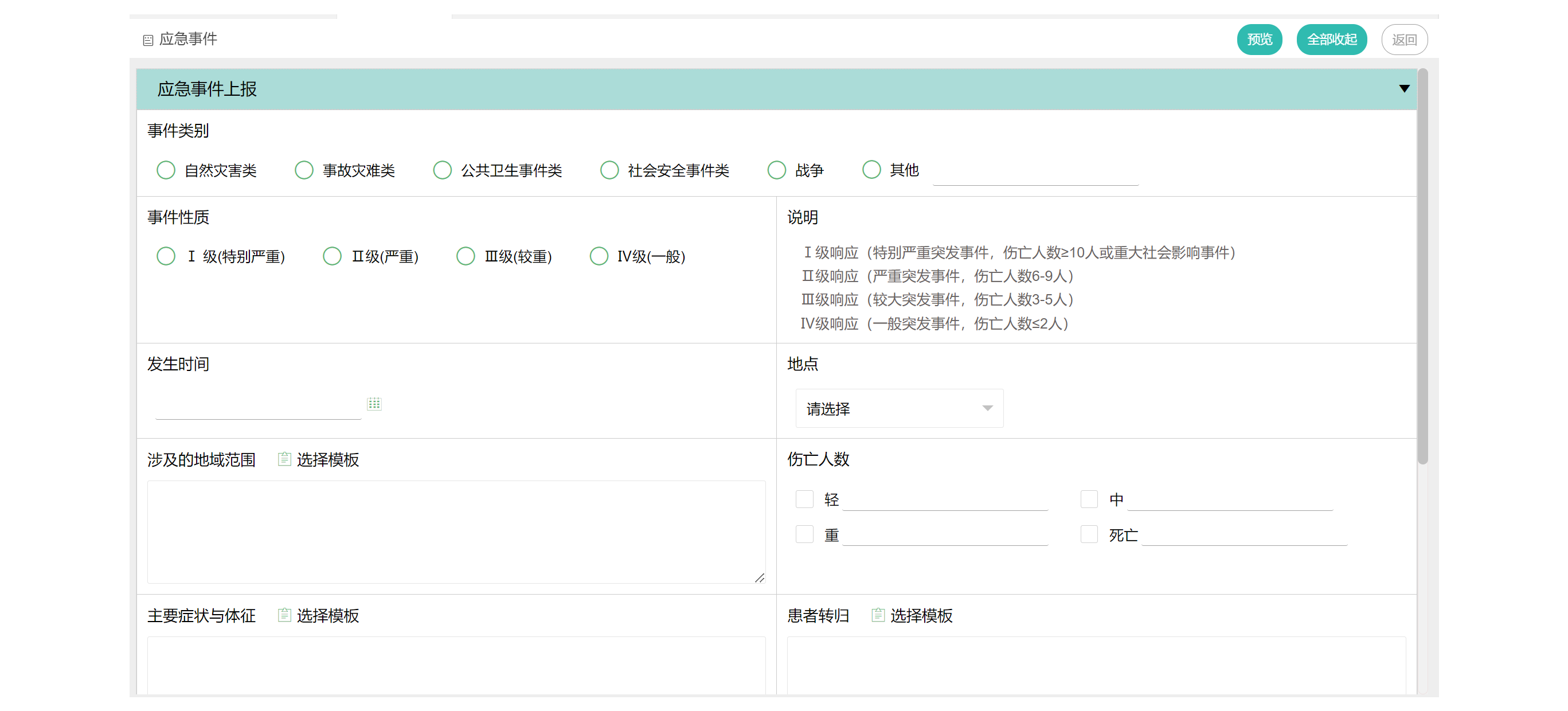- 支持对发生的突发事件进行上报,包括事件类别、事件性质、发生时间、地点、涉及的地域范围、伤亡(轻、中、重、死亡)人数、主要症状与体征、患者转归、已经采取措施、发展趋势、下一步工作计划等内容,为接报者提供评估决策依据。