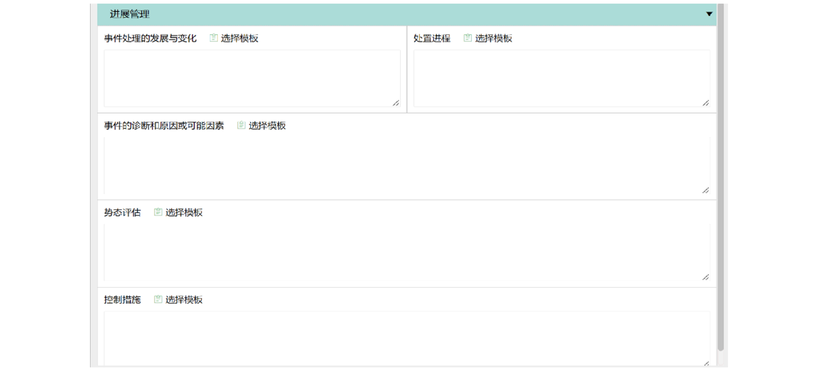 - 支持对应急事件处理的发展与变化、 处置进程、事件的诊断和原因或可能因素,势态评估、控制措施等内容进行管理。